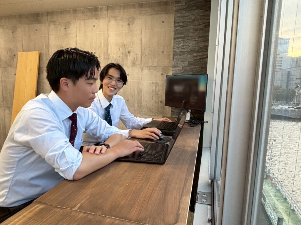 AIインターンで活躍中の大学生・寺ちゃんのお困り相談に乗る、頼もしき先輩・うえもっちゃん(左)
