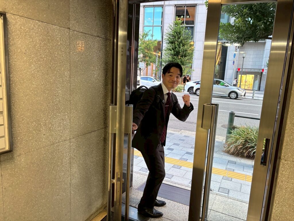 ▲スーツをパリっと着こなし、いよいよ商談へ!